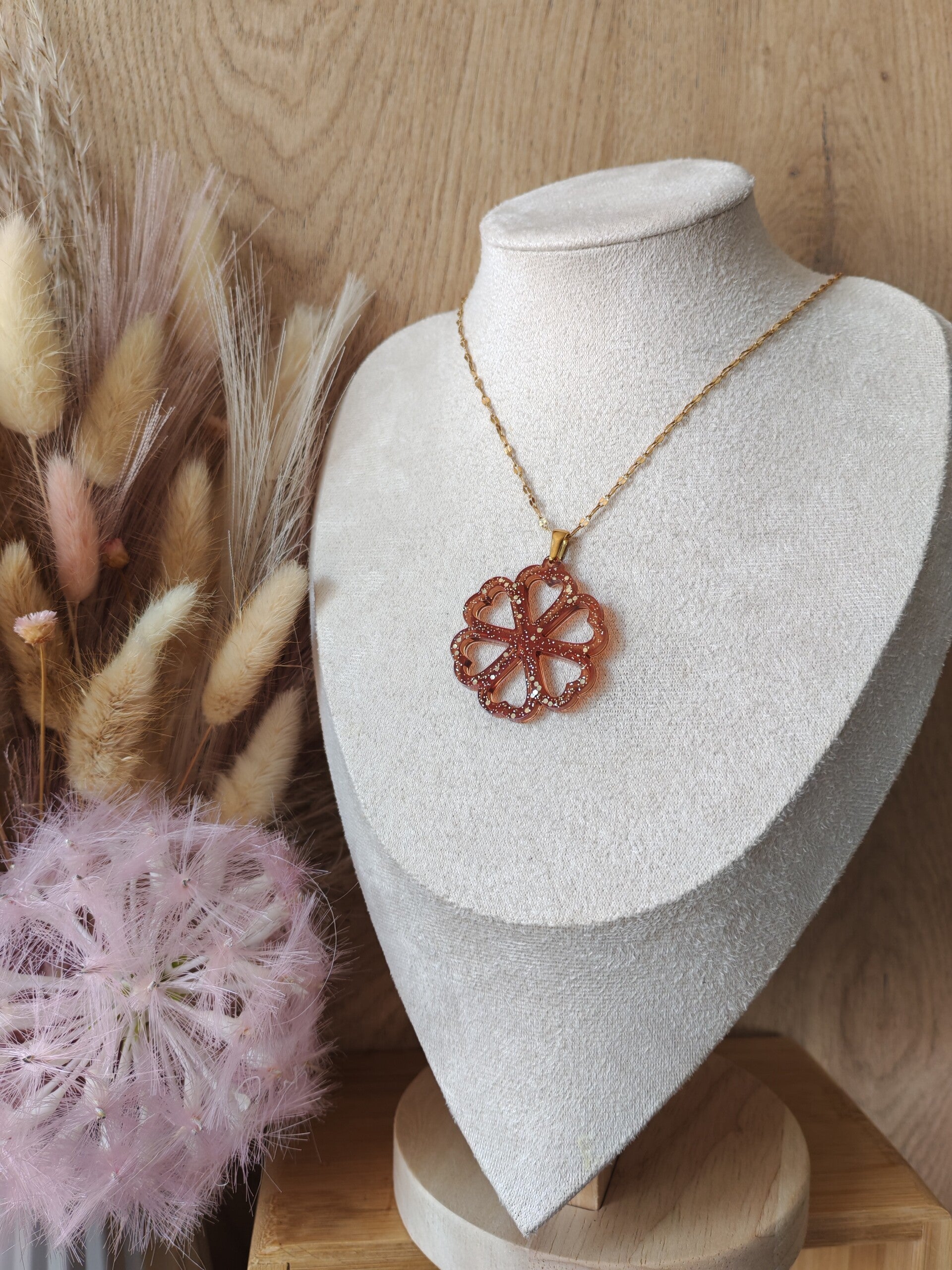 "Cette série de pendentifs célèbre la diversité des formes florales. Chaque pièce est unique, coulée avec soin avec une résine de qualité pour emprisonner des pigments et des paillettes qui créent une profondeur magique. Un design aérien monté sur une chaîne dorée élégante en acier inoxydable, pour une touche de poésie moderne."